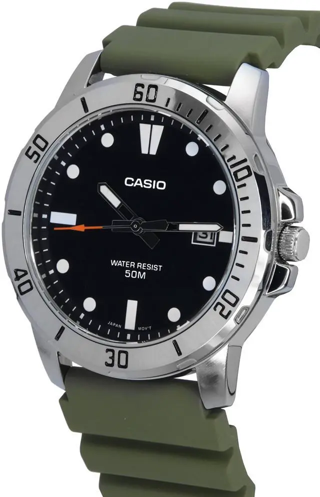 With its striking black dial and practical resin strap, the Casio MTP-VD01-3E stands out as a blend of boldness and functionality. The luminous hands and markers ensure easy time reading, even in dim environments. Powered by precise quartz movement, it delivers unwavering accuracy. A built-in date display adds a touch of practicality, making this watch the perfect companion for those who value both style and reliability.