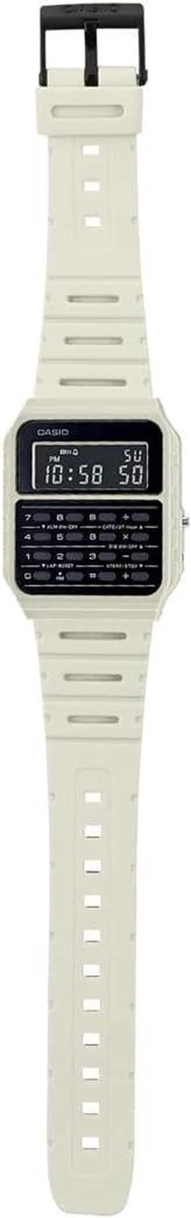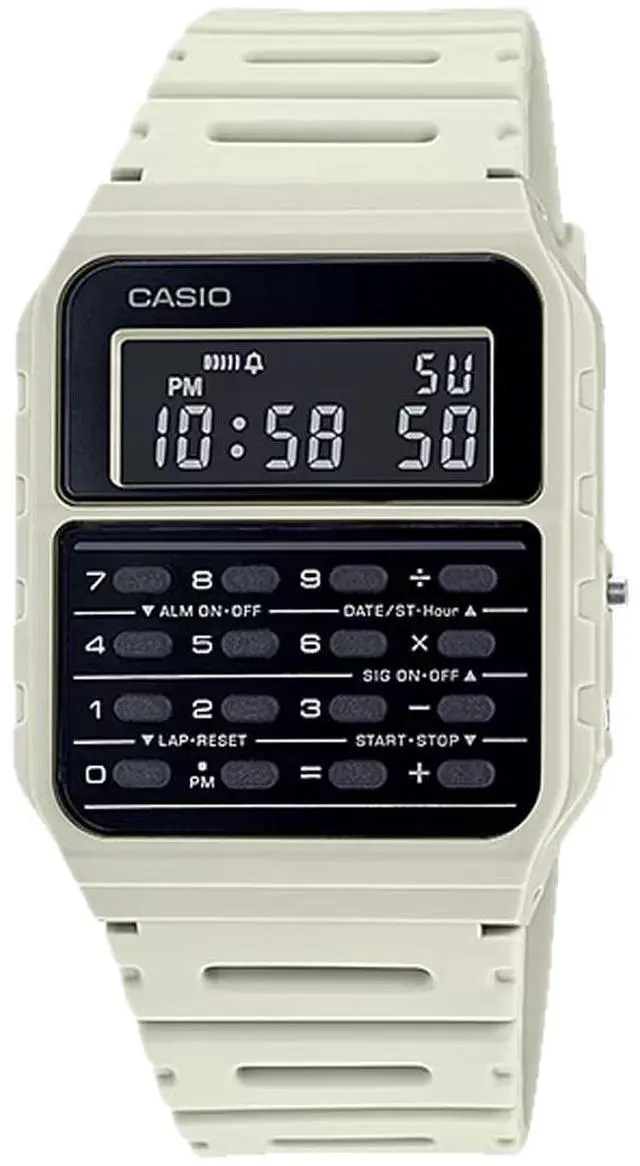 The Casio CA-53WF-8BCF is a modern take on the classic calculator watch, featuring a sleek beige resin band and case that offer both style and durability. Equipped with an 8-digit calculator, it allows users to perform basic arithmetic operations directly from their wrist, making it a practical tool for quick calculations. The watch also includes dual-time functionality, enabling wearers to keep track of two time zones simultaneouslya feature particularly useful for travelers or those coordinating with international contacts. Its compact design, with a case size of 43.2 × 34.4 × 8.2 mm and a weight of just 25 grams, ensures a comfortable fit for daily wear.