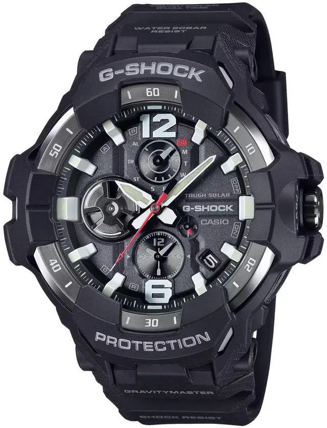 Inspired by next-generation aircraft design the GRB300-1A is a sophisticated and tough timepiece from the GRAVITYMASTER series. This watch features a Carbon Core Guard structure utilizing carbon fiber-reinforced resin for a case that is both lightweight and incredibly strong. Its seamless bezel design and wide triple-layered 3D face are crafted for enhanced readability mimicking a pilots cockpit instrument panel. This model is equipped with Tough Solar technology allowing it to charge from any light source and Mobile Link via Bluetooth for seamless smartphone connectivity. These features provide automatic time adjustment and easy watch settings for world time flight logs and more.