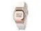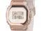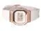 The Casio GM-S5600UPG-4 features a quartz movement and a mineral crystal protecting a gold-tone dial with a digital display. It has a resin case and strap, offering shock resistance. The watch includes a 1/100-second stopwatch, countdown timer, full auto-calendar, 12/24-hour display, and day and date display. Additional features are a multi-function alarm, hourly time signal, flash alert, LED backlight with afterglow, and regular timekeeping. It also has a pink gold ion-plated bezel, screwed case back, buckle clasp, and 200m water resistance.
