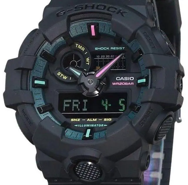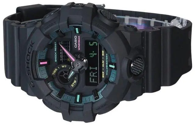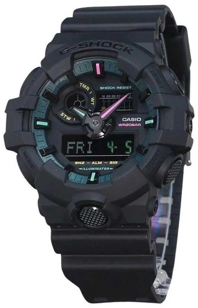 Discover the Casio GA-700MF-1A, featuring a robust bio-based resin case and strap, a precise quartz movement, and a black dial with an analog-digital display. This watch offers world time, a 1/1000-second stopwatch, a countdown timer, and five daily alarms. The LED light ensures visibility in all conditions, while the shock resistance and 200m water resistance make it ideal for any adventure.