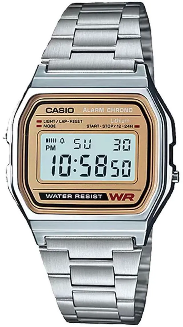 The Casio A158WEA-9 is a timeless digital watch that combines classic design with practical functionality. Featuring a gold-toned dial set within a silver stainless steel band, this watch offers a striking contrast that appeals to those with a taste for vintage aesthetics. Its compact resin case measures 36.8 × 33.2 × 8.2 mm, making it suitable for everyday wear without being cumbersome. The adjustable stainless steel band ensures a comfortable fit for various wrist sizes. Equipped with essential features such as a daily alarm, hourly time signal, and an auto-calendar preset for February with 28 days, it caters to daily scheduling needs.