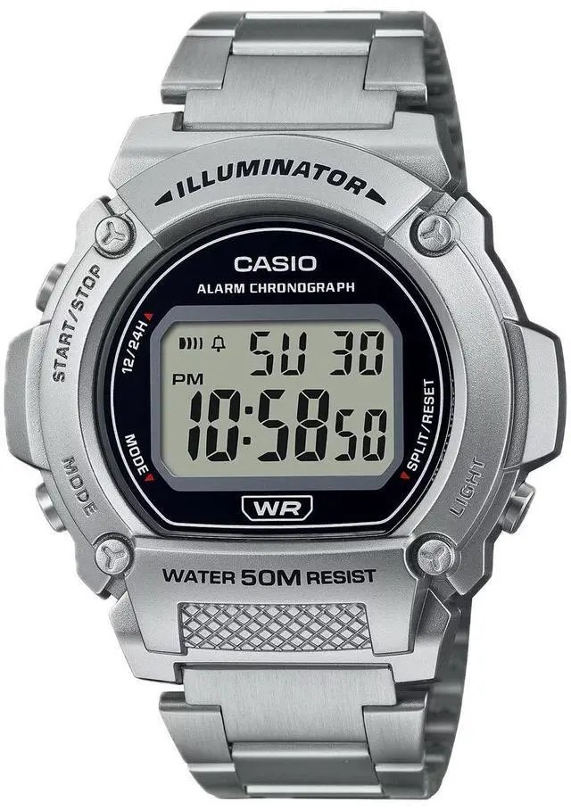 The Casio W-219HD-1AVCF is a digital watch that combines classic design with practical features. It features a resin case measuring 48.1 mm in length, 47mm in width, and 13.9 mm in thickness, ensuring a comfortable and lightweight fit at 89 grams. The watch boasts a clear digital display with large time digits, enhancing readability. An LED backlight ensures visibility in low-light conditions. With a 50-meter water resistance rating, the W-219HD-1AVCF is suitable for daily use, including light water activities. Additional features include a 1/100-second stopwatch, daily alarm, and an auto-calendar set at 28 days for February.