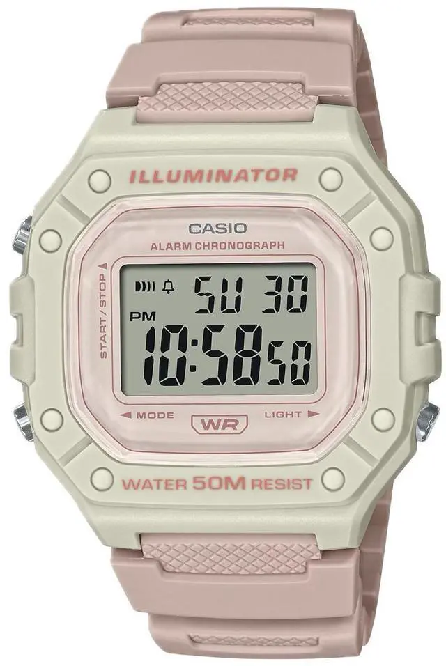 The Casio W-218HC-4A2VCF is a digital watch that blends a classic square design with modern functionality. It features a resin case measuring 44.4 mm in length, 43.2 mm in width, and 11mm in thickness, ensuring a comfortable and lightweight fit at 37 grams. The watch boasts a clear digital display with large time digits, enhancing readability. An amber LED backlight ensures visibility in low-light conditions. With a 50-meter water resistance rating, the W-218HC-4A2VCF is suitable for daily use, including light water activities. Additional features include a 1/100-second stopwatch, daily alarm, and an auto-calendar set at 28 days for February.