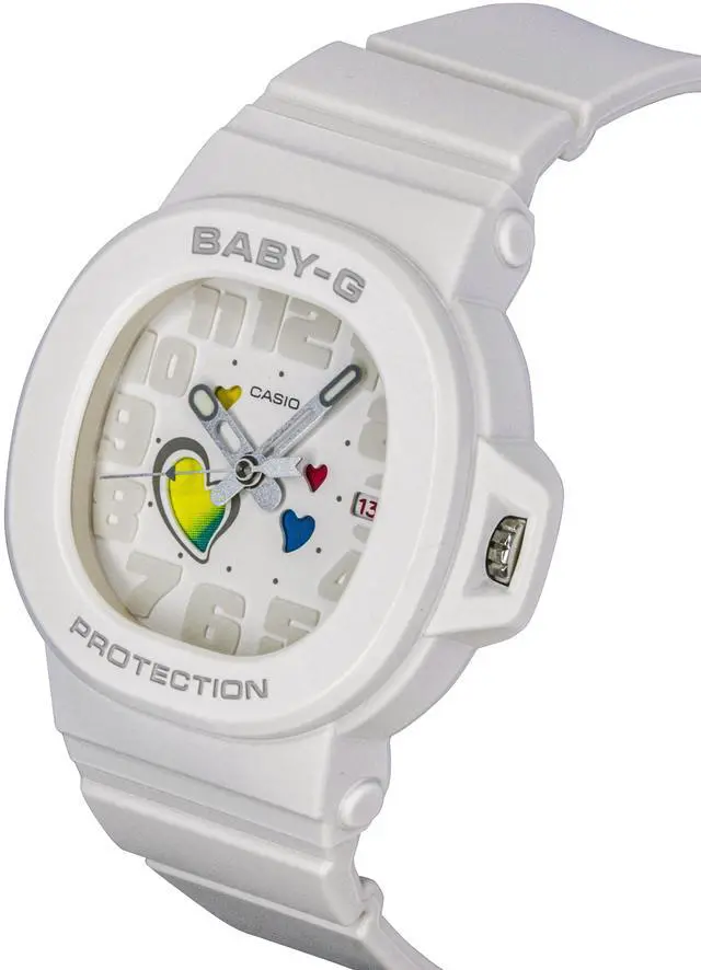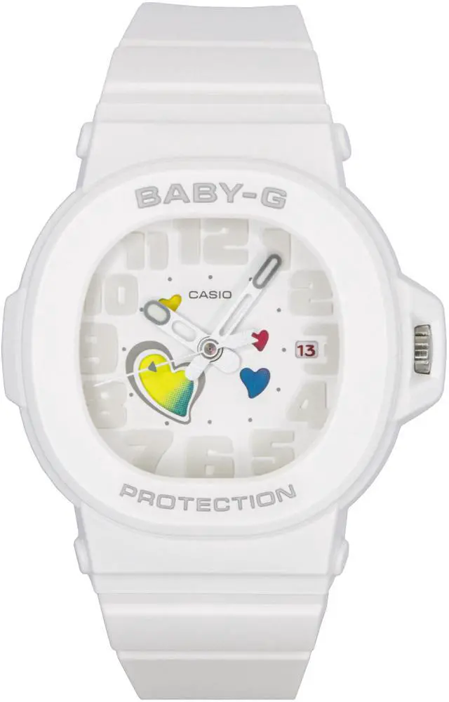 Casio BGA-10-7A brings a playful touch to your wrist with its vibrant white dial and heart-shaped design elements. This stylish analog watch is powered by reliable quartz movement, ensuring accurate timekeeping for daily wear. The 100m water resistance offers versatility for various activities, from swimming to casual outings. The Baby-G collection is known for its rugged durability and trendy look, and the BGA-10-7A is no exception. With its chic and fun design, itâs a perfect addition to any collection of womenâs quartz watches, blending fashion with functionality seamlessly.
