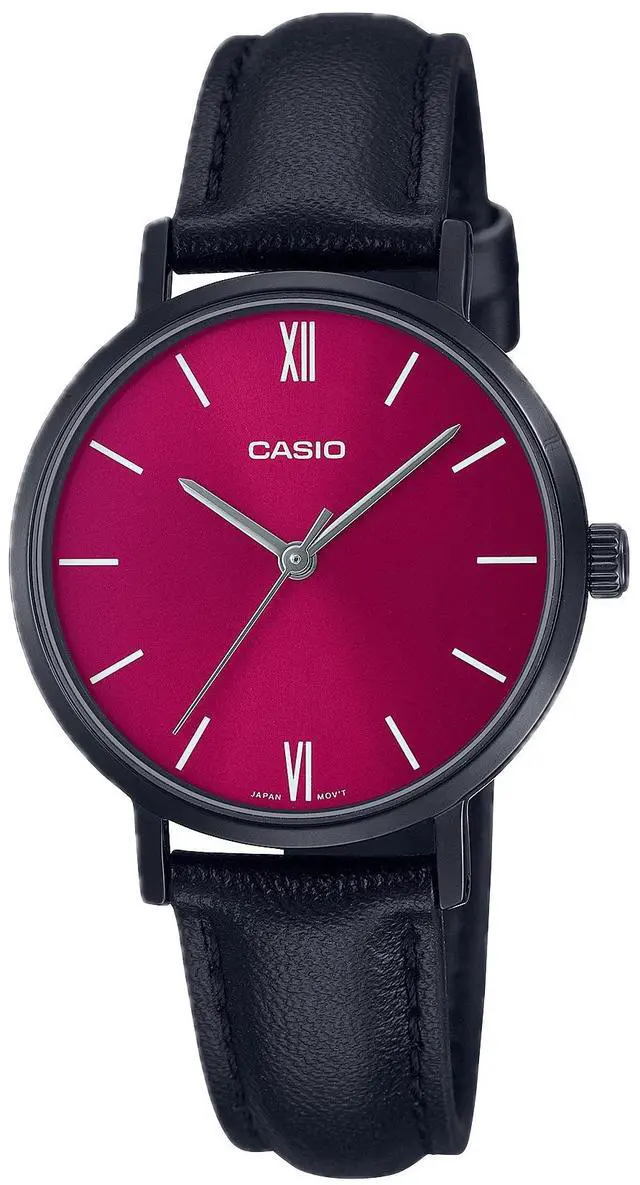 Upgrade your everyday style with the Casio LTP-VT02BL-4A a beautifully balanced womens timepiece that blends minimalist sophistication with reliable performance. Designed for versatility, this analog watch features a striking pink sunray dial set against a sleek black ion-plated stainless steel case and paired with a comfortable black leather strap. Roman numerals at 12 and 6 o'clock offer a refined touch without overwhelming the clean layout.