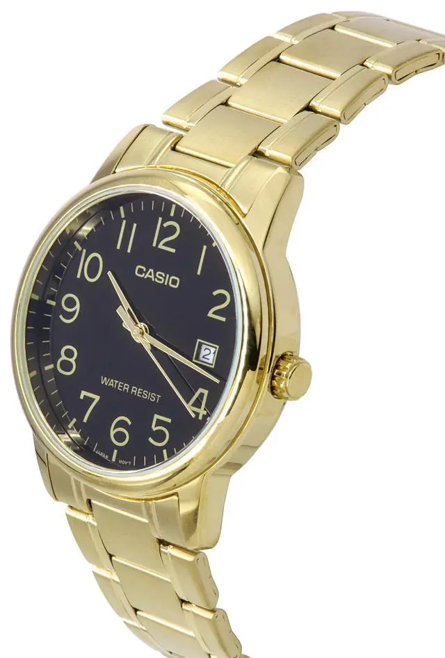 The Casio MTPV002G1B is a refined men's analog dress watch that combines timeless design with reliable performance. Its gold-tone stainless steel case and bracelet exude sophistication, making it an ideal accessory for both formal and casual occasions. The black dial features white Arabic numerals and gold-tone hour markers, ensuring easy readability at a glance. A date window at the 3 oclock position adds practicality to its classic design.