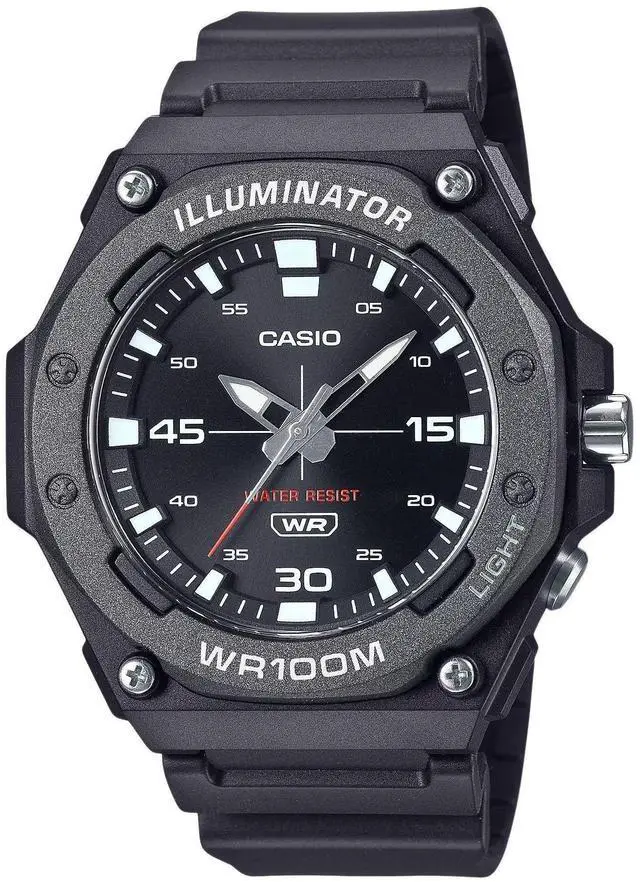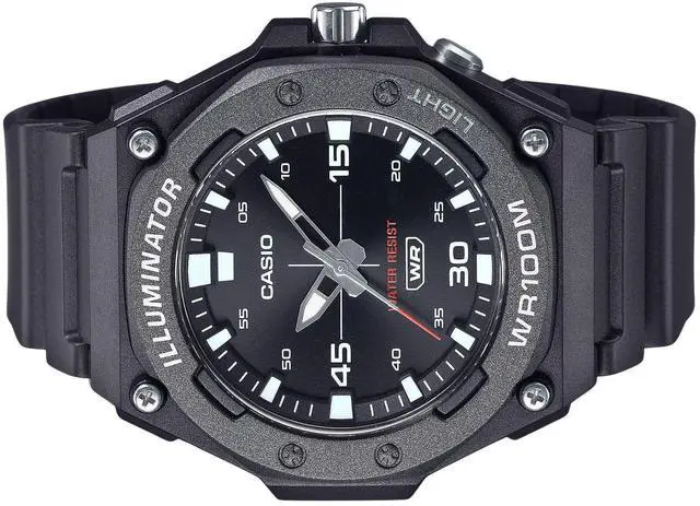The Casio MW-620H-1AV features a durable resin case and strap, housing a quartz movement protected by a resin crystal. The black dial with an analog display is enhanced by an LED light with afterglow for better visibility. It supports regular timekeeping with luminous hands and markers for readability in low light conditions. The watch has a screwed case back, buckle clasp, and 100M water resistance. The case measures approximately 48.10 mm in diameter and 13.60 mm in thickness, offering robustness and functionality.