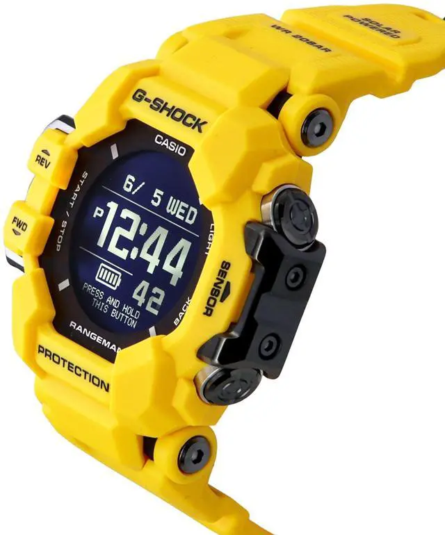 Casio G-Shock Master Of G-Land Rangeman Digital Smartphone Link Solar GPR-H1000-9 GPRH1000-9 200M Men's WatchThe Casio GPR-H1000-9 features a bio-based resin case and strap, combining durability with eco-friendliness. This solar-powered watch boasts a black digital display, offering comprehensive functionalities such as GPS signal reception, multi-sport function, and training analysis. It includes wrist heart rate and blood oxygen level measurement, a digital compass, altimeter, barometric pressure, and temperature measurements. Additional features include mobile link, auto time adjustment, tide graph, moon data, sunrise and sunset display, and 200M water resistance.