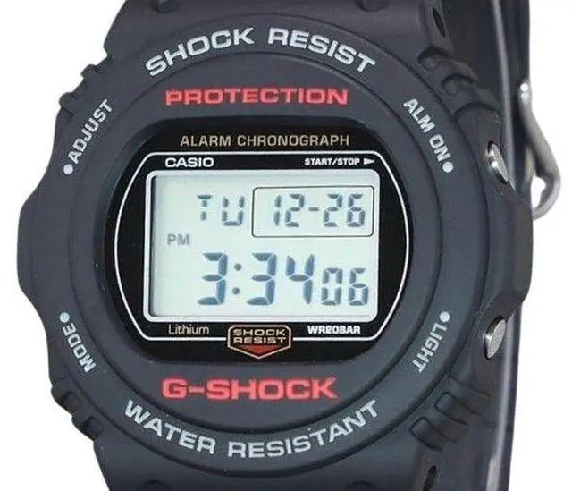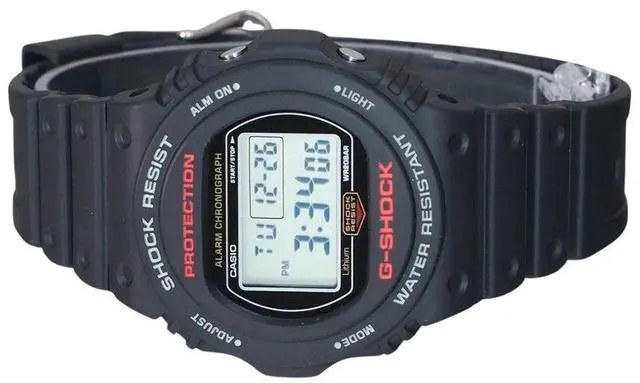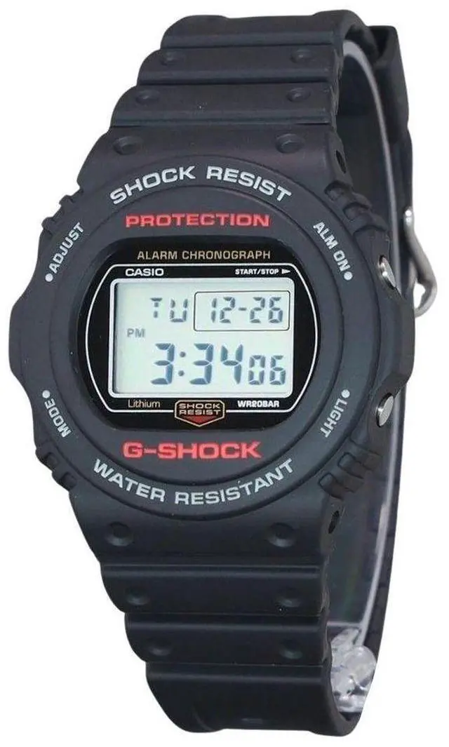 Casio G-Shock Digital Resin Strap Quartz DW-5750UE-1 DW5750UE-1 200M Men's WatchThe Casio DW-5750UE-1 features a black dial with a digital display, housed in a shock-resistant resin case and strap. Powered by quartz movement and protected by a mineral crystal, this watch includes a 1/100 second stopwatch, countdown timer, hourly time signal, multi-function alarm, flash alert, and LED backlight with afterglow. Additional functionalities are regular timekeeping, full auto calendar, 12/24 hours display, day and date display, a screwed case back, buckle clasp, and 200m water resistance.