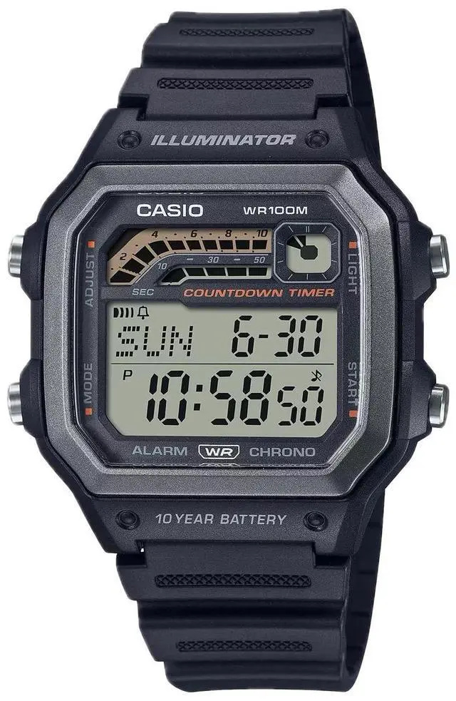 The Casio WS-1600H-1AVCF is a digital sports watch that combines a retro-inspired design with modern functionality. Drawing inspiration from 1990s sports aesthetics, its face features two bars and a circle at the top, displaying