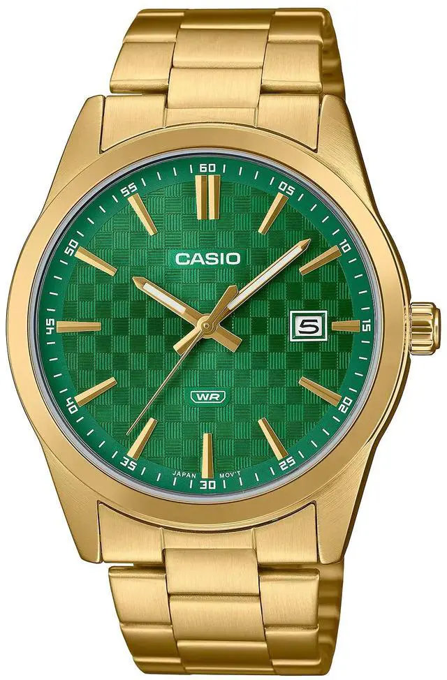 The Casio MTP-VD03G-3AUDF stands out with a bold blend of luxury and color. Featuring a striking green textured dial paired with a lustrous gold stainless steel bracelet, this timepiece delivers a sophisticated yet vibrant look. The analog display with gold-tone markers and hands ensures elegant readability, while the date window at 3 oclock adds everyday practicality. Driven by reliable quartz movement and water resistant for daily wear, this watch captures the perfect balance between modern flair and timeless craftsmanship.