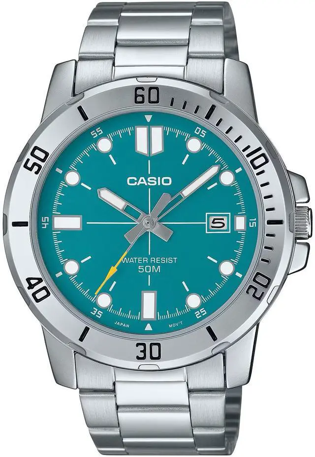 The Casio MTP-VD01D-3E2VUDF stands out with its bold teal dial and polished silver-tone case. This watch blends a sporty and refined aesthetic, featuring luminous markers and hands for clear visibility in any setting. A sturdy stainless steel bracelet and 50-meter water resistance make it perfect for everyday wear and casual adventures. Designed for men who appreciate both durability and distinctive style.