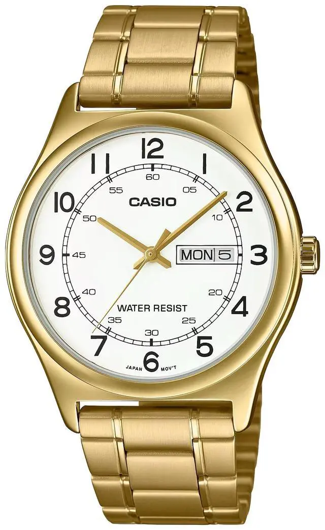 The Casio MTP-V006G-7B blends classic sophistication with practical functionality. Its crisp white dial features black Arabic numerals, gold-tone hands, and a convenient day-date display for easy readability. The gold stainless steel bracelet adds a refined touch, making this watch perfect for business meetings, formal occasions, or daily wear. With reliable water resistance and durable craftsmanship, its a timeless piece that complements any style.