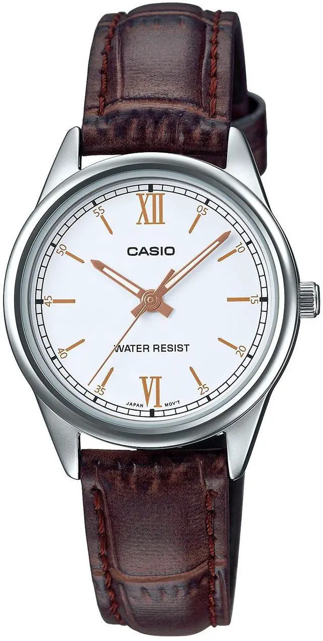 The Casio LTP-V005L-7B3UDF blends timeless design with everyday elegance. Featuring a crisp white dial with rose-gold Roman numerals at 12 and 6 oclock, this watch exudes refined simplicity. The brown leather strap adds a touch of warmth and sophistication, making it a perfect match for both casual and formal attire. Designed for comfort and precision, its a beautiful accessory that enhances any look.
