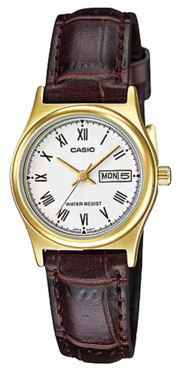 The Casio LTP-V006GL-7B is a refined womens timepiece that captures classic elegance. Featuring a clean white dial with black Roman numeral markers and a gold-tone case, this watch evokes timeless sophistication. The brown leather strap adds warmth and comfort, making it suitable for both everyday wear and special occasions. With practical day and date display windows and a water-resistant design, this watch balances tradition, function, and enduring style.