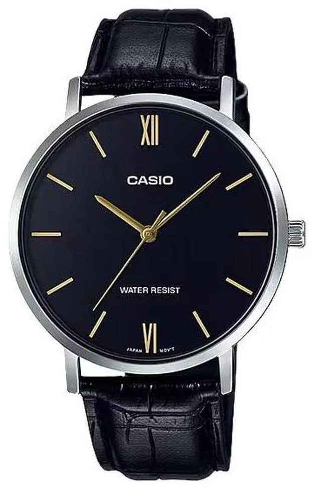 The Casio MTP-VT01L-1BUDF is a refined analog watch created for men who appreciate understated style and everyday functionality. It features a black dial paired with a black genuine leather strap, combining a sleek look with practical design. The stainless steel round case offers a smart, polished appearance suited for both professional and casual settings. Protected by mineral glass, the display provides clarity and durability, while its water-resistant build gives confidence for daily wear.