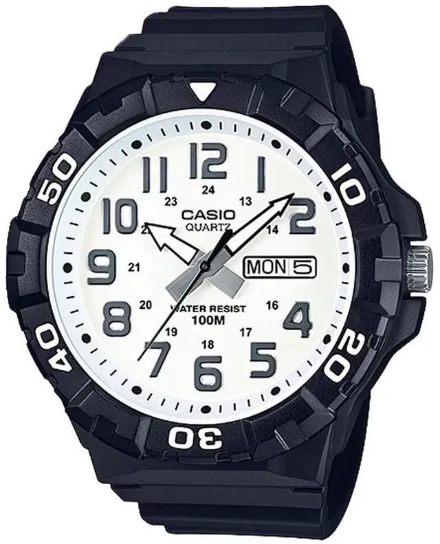 The Casio MRW-210H-7AV is a robust analog watch designed for men, featuring a large, easy-to-read dial. Its sporty aesthetic is complemented by practical functionalities, making it suitable for both everyday wear and outdoor activities. The watch boasts a 100-meter water resistance, ensuring durability during water-related activities. A day and date display is conveniently positioned on the dial, keeping the wearer informed of the current date and day of the week. The bi-directional rotating bezel adds functionality and a classic diver-style appearance. Constructed with a resin case and band, the MRW-210H-7AV is both lightweight and comfortable on the wrist.