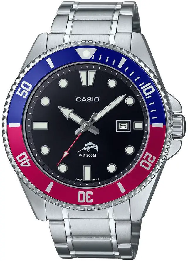 The Casio MDV-106DD-1A2VCF combines strength, style, and precision for those who appreciate classic diver aesthetics. Featuring a sleek stainless steel bracelet and case, this timepiece stands out with its deep black dial complemented by bold blue and red accents on the bezeladding a sporty yet refined touch. Designed for both underwater performance and everyday wear, it offers 200-meter water resistance, luminous hands and markers, and a practical date display.