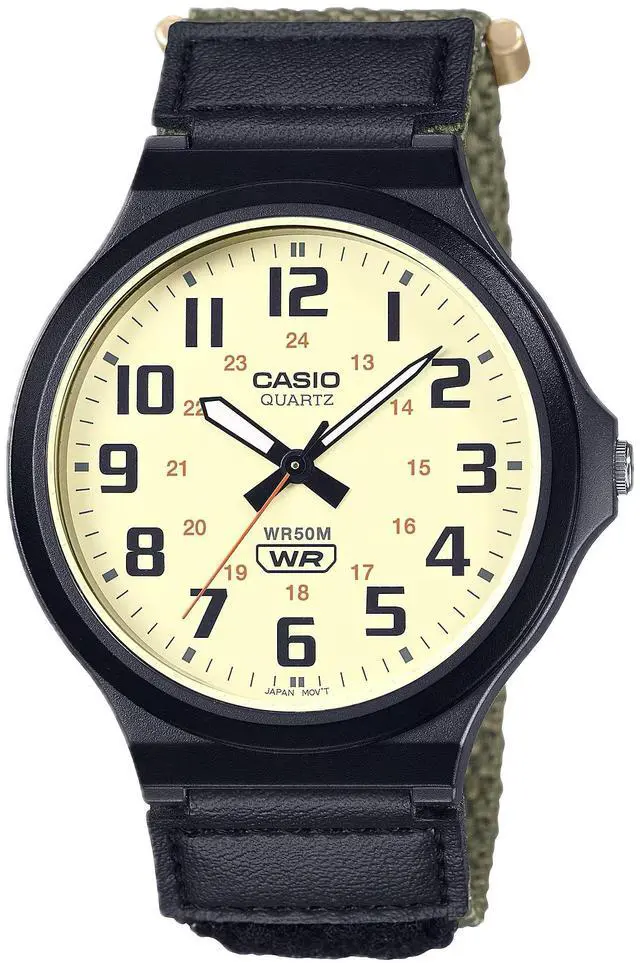 The Casio MW-240B-3BVCF is a mens analog watch that combines a classic look with an outdoorsy twist. It features a large beige dial with orange accents, ensuring clear visibility and a unique aesthetic. The two-tone cloth band in earthy colors complements outdoor fashions and provides a comfortable fit. With a 50-meter water resistance, this timepiece is suitable for everyday use, including exposure to rain or washing up. Its lightweight construction ensures comfortable wear throughout the day. Powered by a reliable quartz movement, the MW-240B-3BVCF offers accurate timekeeping with minimal maintenance.