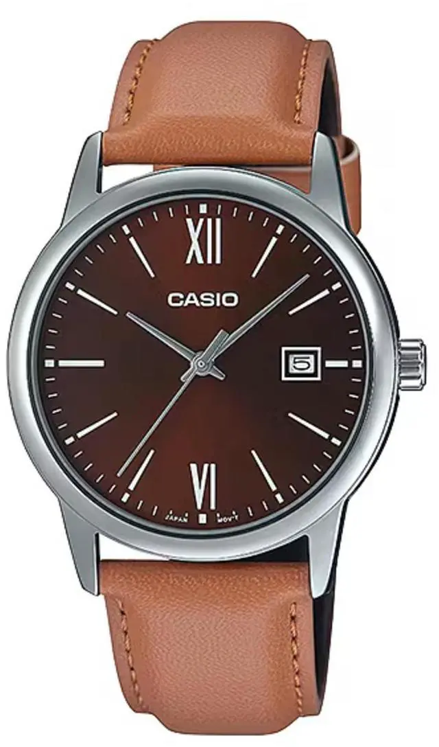 The Casio MTP-V002L-5B3UDF is a classic analog watch crafted for men who value timeless style and functionality. It features a rich brown dial with contrasting hour markers and a matching brown genuine leather strap for a cohesive, elegant look. The date display at 3 oclock adds practicality, while the mineral glass and stainless-steel case ensure everyday durability. Designed for daily wear, it offers water resistance suitable for light splashes and routine use.