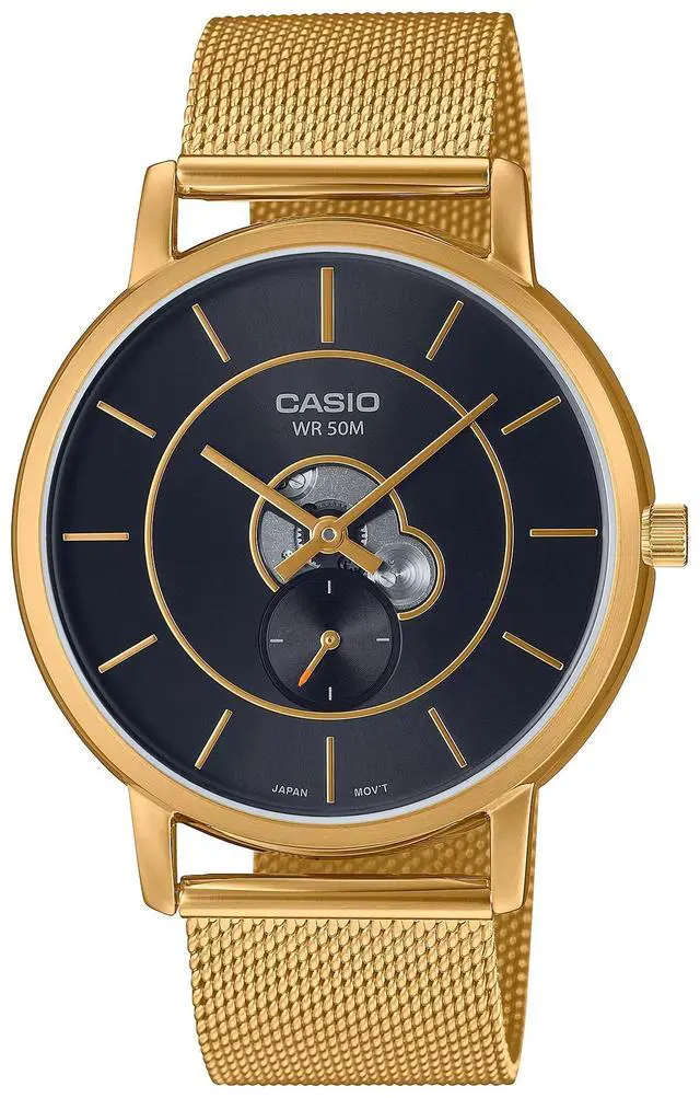 The Casio MTP-B130MG-1AVDF delivers a bold yet minimalist look for the modern man. Featuring a sleek black dial with gold-tone markers and hands, this watch pairs beautifully with a matching gold mesh bracelet for a refined, contemporary aesthetic. Its dual-layered dial design adds depth, while 50-meter water resistance ensures reliable performance for daily wear. Perfect for both business and casual settings, this timepiece embodies understated sophistication.