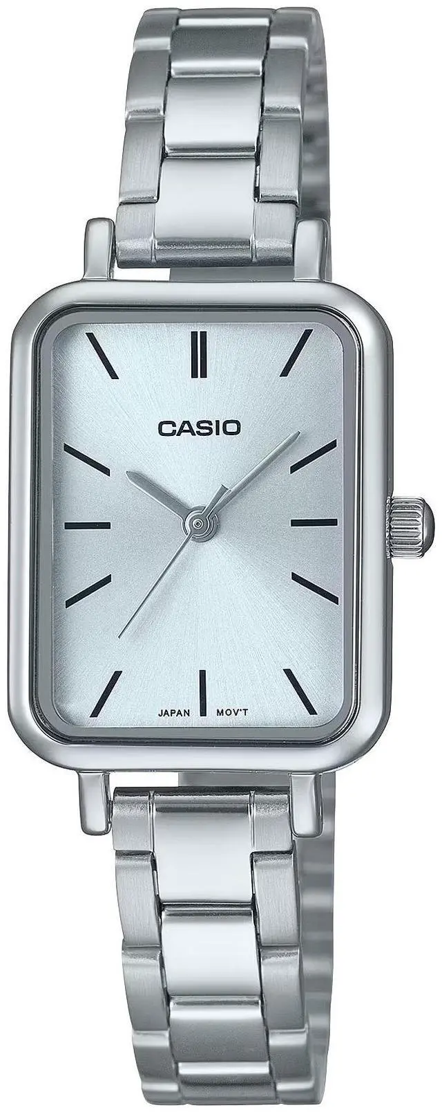 The Casio LTP-V009D-2EUDF combines modern elegance with timeless simplicity. Featuring a light blue rectangular dial with slim black hour markers, this watch exudes understated sophistication. Its stainless steel bracelet complements the polished silver-tone case, creating a refined aesthetic for everyday wear. With reliable quartz movement and water resistance, this watch offers both style and practicality for women who appreciate minimalist beauty.
