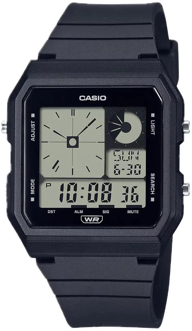 The Casio LF-20W-1ACF is a modern digital watch that combines functionality with a sleek design. Featuring a compact square case measuring approximately 33 × 33 × 8.6 mm, it offers a comfortable fit suitable for daily wear. The watch showcases a black resin band and case, exuding a minimalist and versatile aesthetic. Its unique LCD is divided into digital and analog-style sections; the analog-style clock on the upper left displays the home time, while the graphic at the upper right indicates the progress of various functions. Equipped with practical features, the LF-20W-1ACF includes an LED backlight for easy readability in low-light conditions, a stopwatch, countdown timer, world time, and five daily alarms to keep you on schedule.