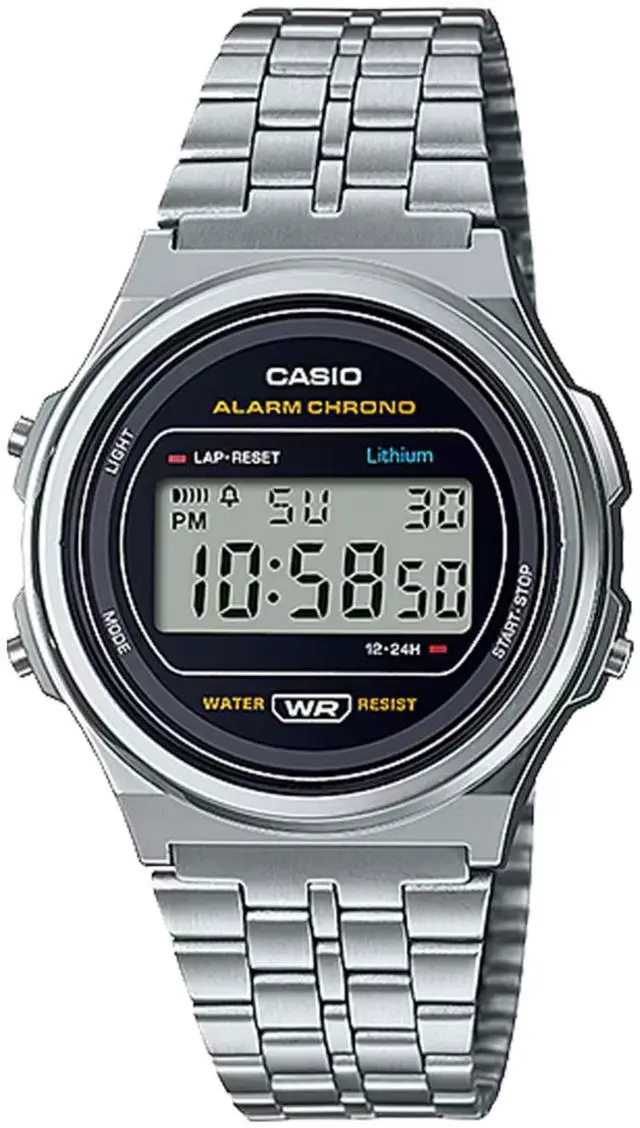 The Casio A-171WE-1ACF is a digital watch that blends vintage aesthetics with modern functionality, appealing to both men and women. Its design features a silver-tone stainless steel band and a round resin case with chrome plating, offering durability and a classic look. The watch is equipped with essential features such as a 1/100-second stopwatch, daily alarm, hourly time signal, and an auto-calendar programmed until 2099. An LED light with afterglow ensures readability in low-light conditions. The timepiece operates on a quartz movement, providing reliable timekeeping. With a water resistance suitable for everyday use, it can withstand splashes but is not recommended for swimming or bathing.