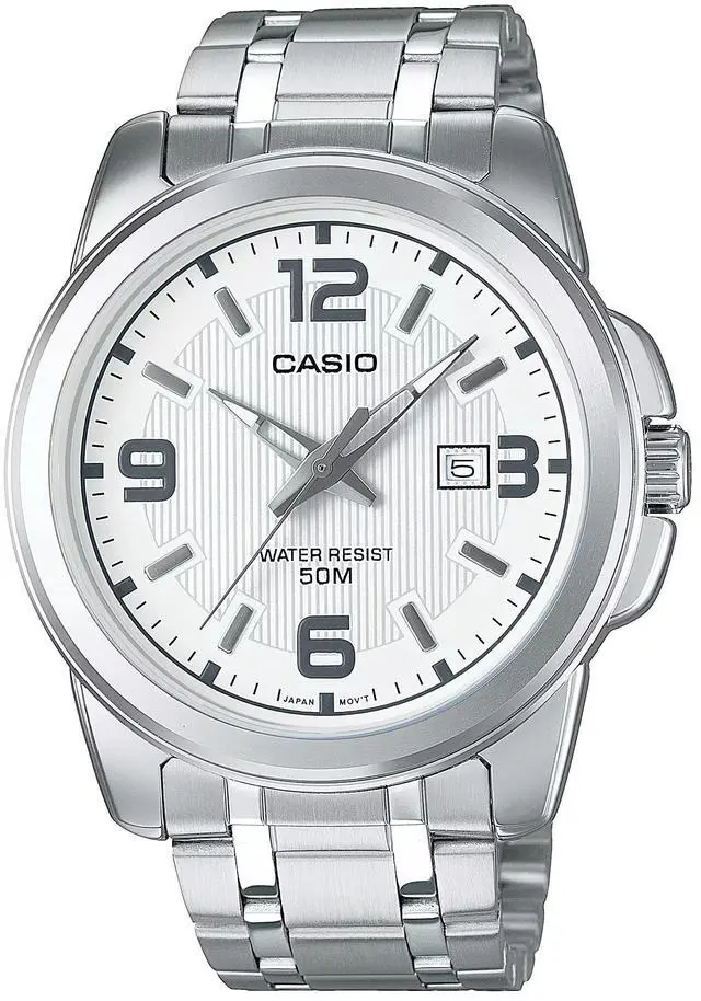 The Casio MTP-1314D-7AV is a bold and refined mens analog watch crafted for reliable everyday wear. It features a clean white dial with large Arabic numerals for easy readability and a date display at 3 oclock for convenience. The polished stainless steel case and bracelet offer a sophisticated look suitable for any occasion. With mineral glass protection and 50-meter water resistance, this watch combines durability with timeless style.