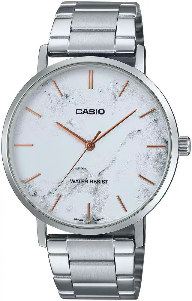 The Casio MTP-VT01DM-7AUDF brings modern elegance to a classic analog design. Featuring a distinctive marble-pattern dial accented with rose gold-tone hands and markers, this watch stands out with refined simplicity. The stainless steel bracelet and slim case create a polished silhouette suitable for both professional and casual wear. With reliable quartz movement and water resistance, its built for timeless style and daily performance.