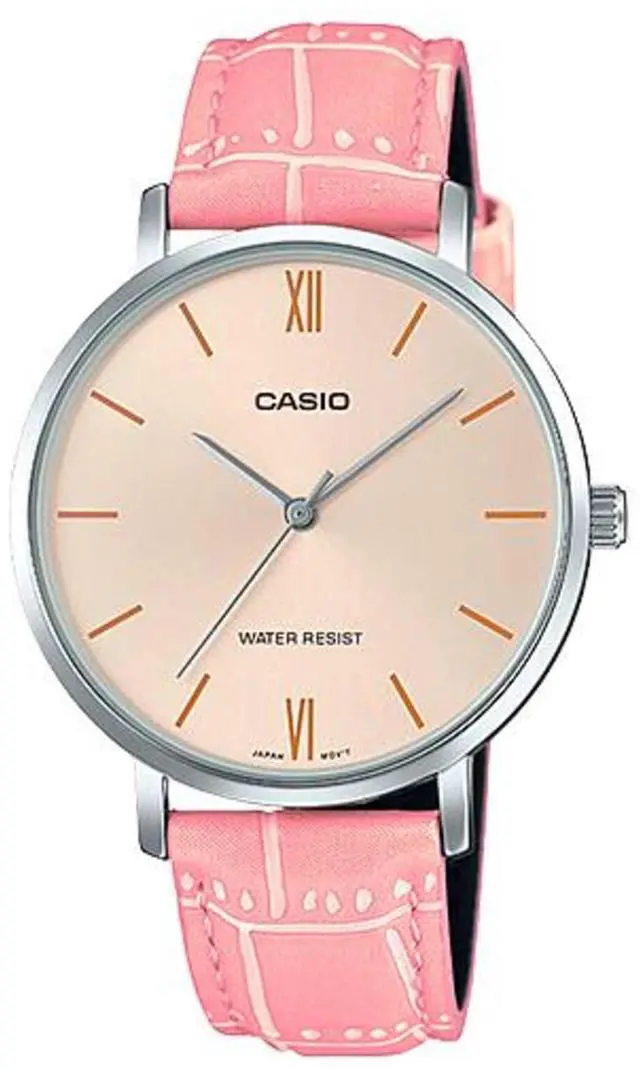 The Casio LTP-VT01L-4BUDF is a feminine and modern womens analog watch that combines soft tones with refined minimalism. It features a champagne dial complemented by slim gold-tone markers and hands, set within a polished stainless steel case. The pink leather strap adds a playful yet elegant touch, making it perfect for both casual and dress wear. With mineral glass for durability and water resistance for everyday use, this watch brings effortless charm to any outfit.
