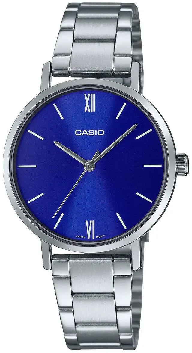 The Casio LTP-VT02D-2AUDF is a timeless analog watch designed for women who appreciate minimalist elegance. It features a blue dial with Roman numeral markers at 12 and 6 oclock for subtle sophistication, paired with a polished stainless-steel case and matching bracelet. With a slim profile and Water Resistant construction, this timepiece is ideal for everyday wear.