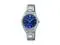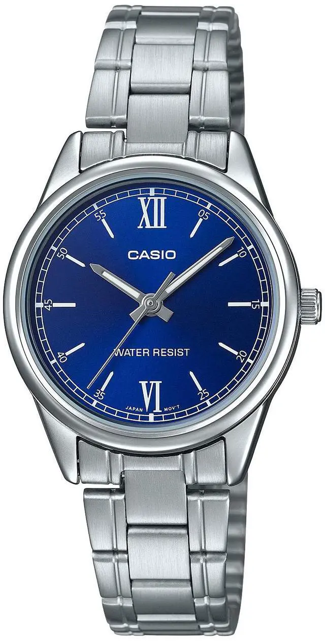 The Casio LTP-V005D-2B2UDF is an elegant womens analog timepiece designed with simplicity and everyday practicality in mind. It features a vibrant blue dial housed in a polished stainless-steel case and secured by a matching stainless-steel bracelet. With clear markers and slender hands for easy readability, this watch delivers refined style for daily wear. The mineral glass crystal protects the dial, and the Water Resistant label affords light moisture protection.