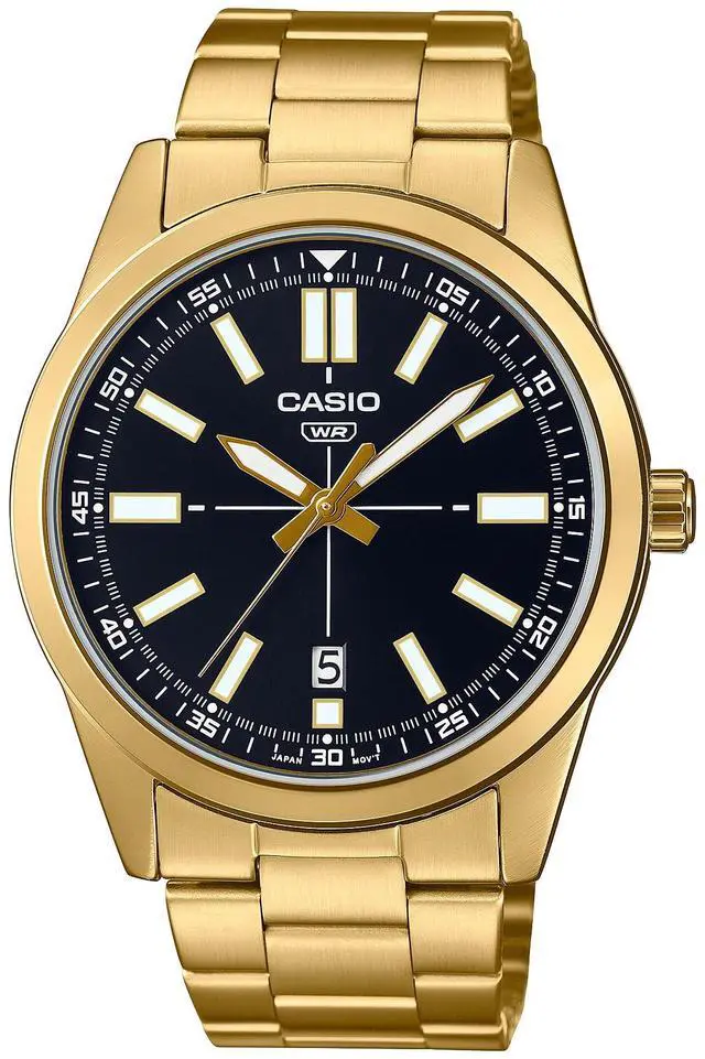 The Casio MTP-VD02G-1EUDF showcases a bold fusion of luxury and simplicity. Its deep black dial, framed by a radiant gold-tone stainless steel case and bracelet, exudes timeless elegance. Featuring luminous hands and hour markers, a date window at 6 oclock, and water resistance for everyday wear, this watch is designed for modern men who appreciate a refined yet powerful look.