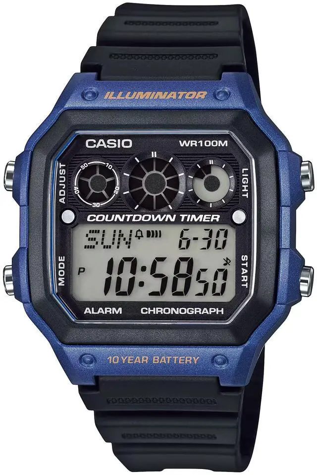 The Casio AE-1300WH-2AVDF is a rugged digital watch built for everyday performance and sport-style practicality. It features a bold resin case with blue-accented bezel and a matching black resin strap. Equipped with world time for 48 cities (29 time zones), a 1/100-second stopwatch, an interval timer with 9 preset settings, multiple alarms and an LED backlight, this watch brings versatile timing functions together in a durable package. With 100-meter water resistance, its prepared for swim-friendly use as well.