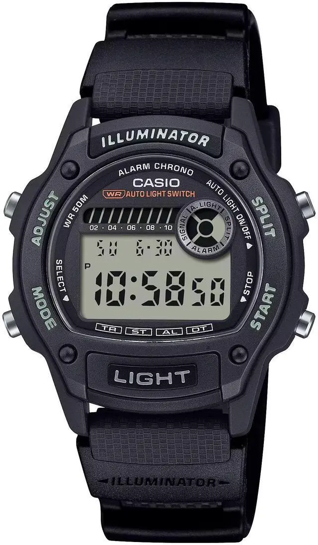 This Casio mens digital watch delivers everyday comfort with a mid sized 36.6 mm case designed to fit naturally on slimmer wrists. The clean gray digital dial is paired with a classic all-black design for a versatile, no frills look. A fully automatic LED backlight and a dedicated front light button provide quick visibility in low light conditions. Built for daily reliability, this watch offers essential digital functions in a lightweight, durable form.