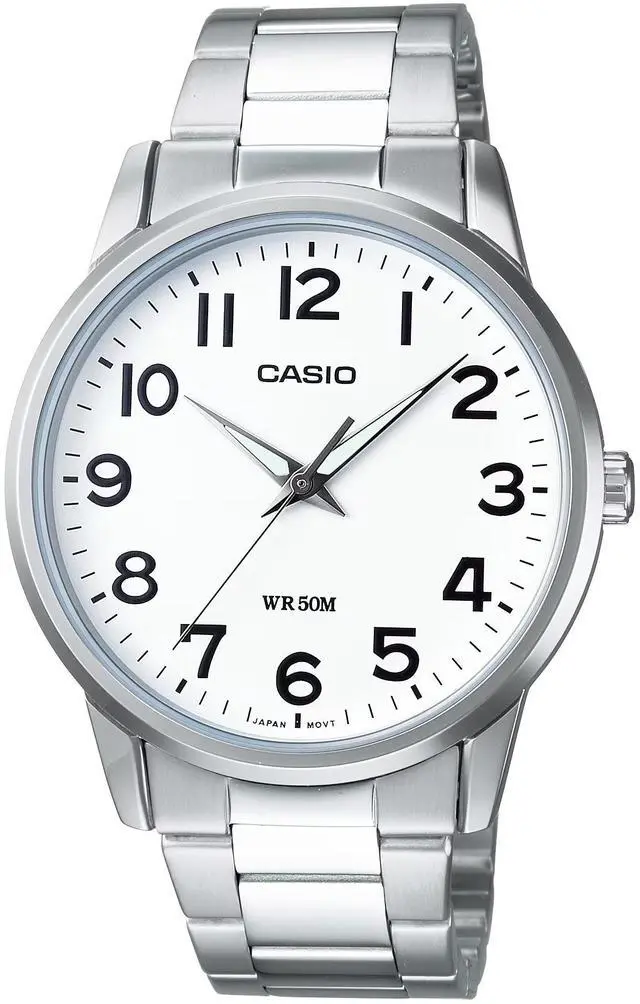 This Casio mens analog watch features a clean white dial paired with a polished stainless steel bracelet for a timeless everyday look. Bold black numerals provide excellent readability while maintaining a classic, balanced design. The round case offers a comfortable fit that transitions easily from work to casual wear. Subtle detailing keeps the dial uncluttered and refined. Built for daily use, this watch delivers dependable performance with understated style.