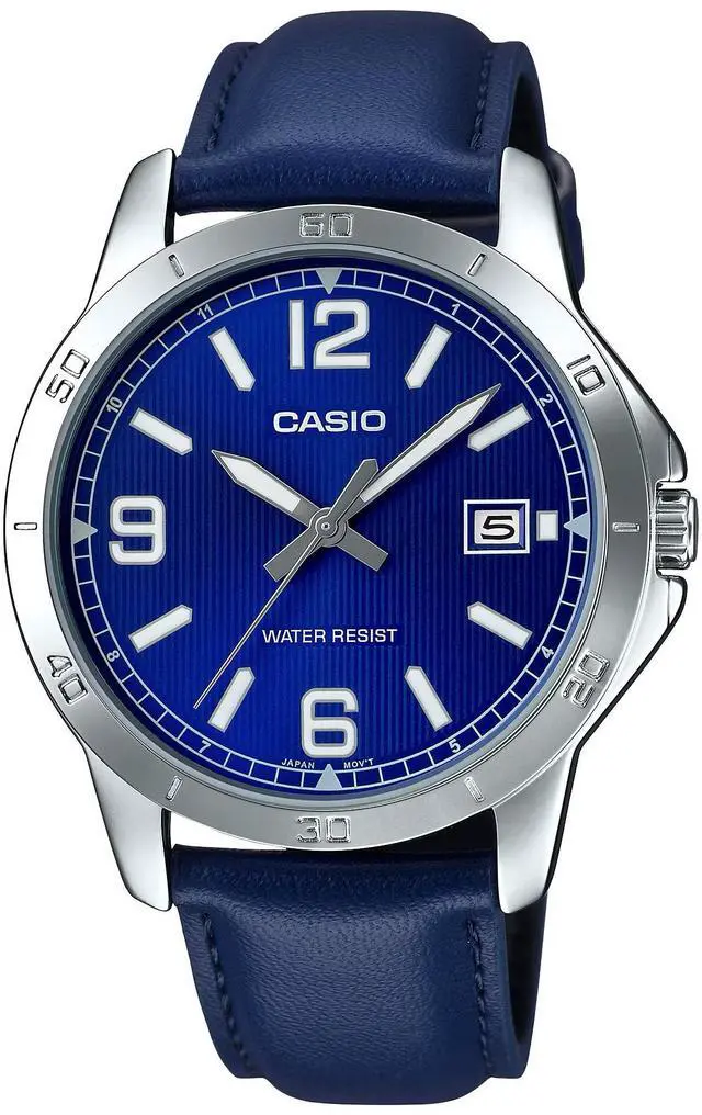 The Casio MTP-V004L-2BUDF combines modern style with everyday functionality. Featuring a bold blue dial with silver-tone markers and a matching blue leather strap, this watch delivers a coordinated and refined look. The date display at 3 oclock adds practical convenience, while the stainless steel bezel enhances its sleek aesthetic. With quartz precision and water resistance, its a reliable choice for men who value both sophistication and performance in their daily wear.
