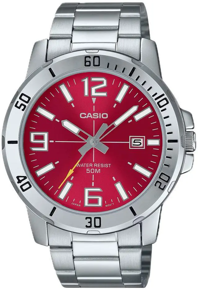 The Casio MTP-VD01D-4BVUDF is a bold analog timepiece crafted for men who appreciate a strong presence and functional everyday design. Featuring a vibrant red dial housed in a robust stainless steel case and paired with a matching stainless steel bracelet, it offers a cohesive and sporty look. With a three-hand analog display, date window, mineral glass crystal for clarity and durability, and water resistance for daily readiness, this watch blends confidence with reliability.
