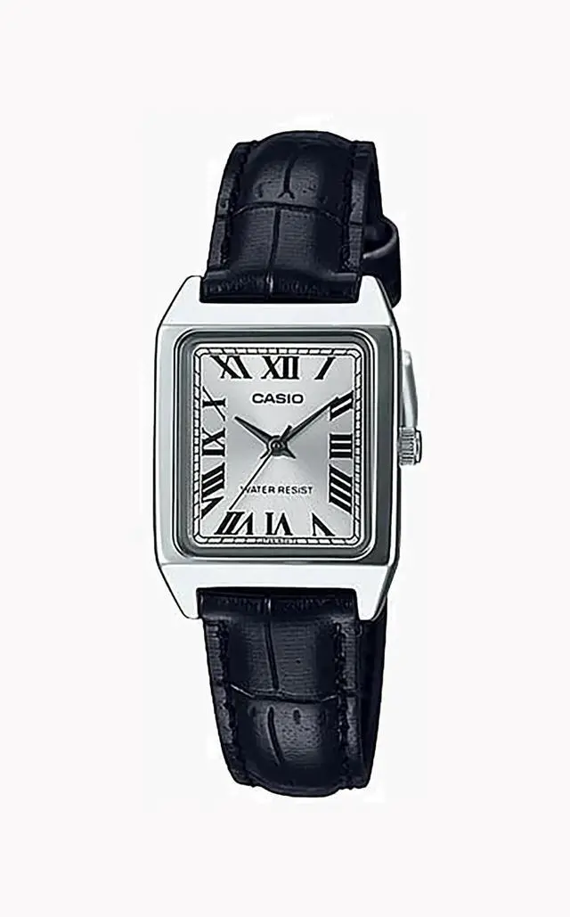 This Casio womens analog watch pairs a black strap with a silver dial for a clean everyday look. The minimalist dial layout keeps the design refined and easy to read. Its slim profile sits comfortably on the wrist throughout the day. Designed for simple daily wear without excess detail. A versatile option for casual and work settings.