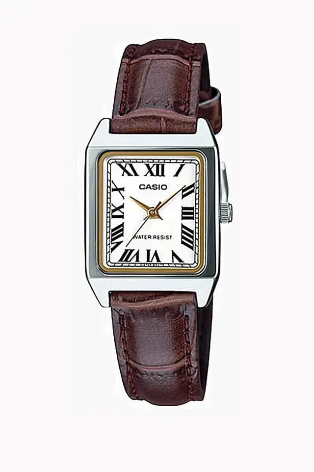 This Casio womens analog watch features a warm brown strap paired with a bright white dial. The contrast keeps the face easy to read while maintaining a soft classic look. Designed with a slim case for comfortable daily wear. A timeless style that feels light on the wrist. Suitable for everyday routines and casual outfits.