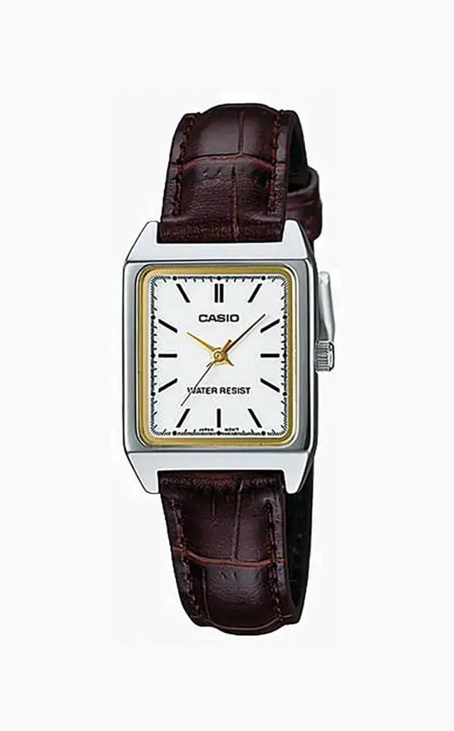 This Casio womens analog watch features a brown strap matched with a clean white dial. The neutral color pairing offers a relaxed everyday look. Designed with a slim case for comfortable wrist wear. Easy to read analog markers keep the design practical. A dependable choice for daily routines.