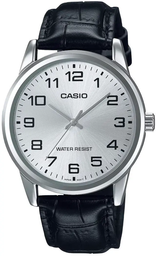 This Casio mens analog watch features a refined silver dial that delivers a clean and versatile look. Bold Arabic numerals make the time easy to read in both bright and low-light settings. The black leather strap offers a comfortable fit while maintaining a classic style. A simple three hand layout keeps the design balanced and uncluttered. Built for everyday use, this watch pairs easily with casual and professional outfits.