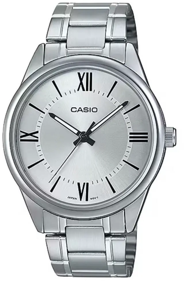 This Casio mens analog watch features a clean silver dial paired with a stainless steel bracelet for a refined everyday look. Roman numeral hour markers add a classic touch while keeping the layout easy to read. The simple three hand design keeps the dial balanced and uncluttered. A smooth metal bracelet offers durability and comfort for daily wear. Designed for versatility, this watch works well in both professional and casual settings.