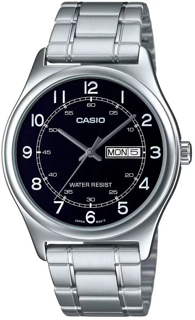 This Casio mens analog watch features a black dial paired with a stainless steel bracelet for a sharp, everyday look. The dial layout includes both day and date displays for added daily convenience. Large numerals and inner minute markings make the time easy to read at a glance. The solid metal bracelet provides a secure and comfortable fit for regular wear. Designed for versatility, this watch suits workdays, casual outings, and daily routines.