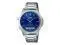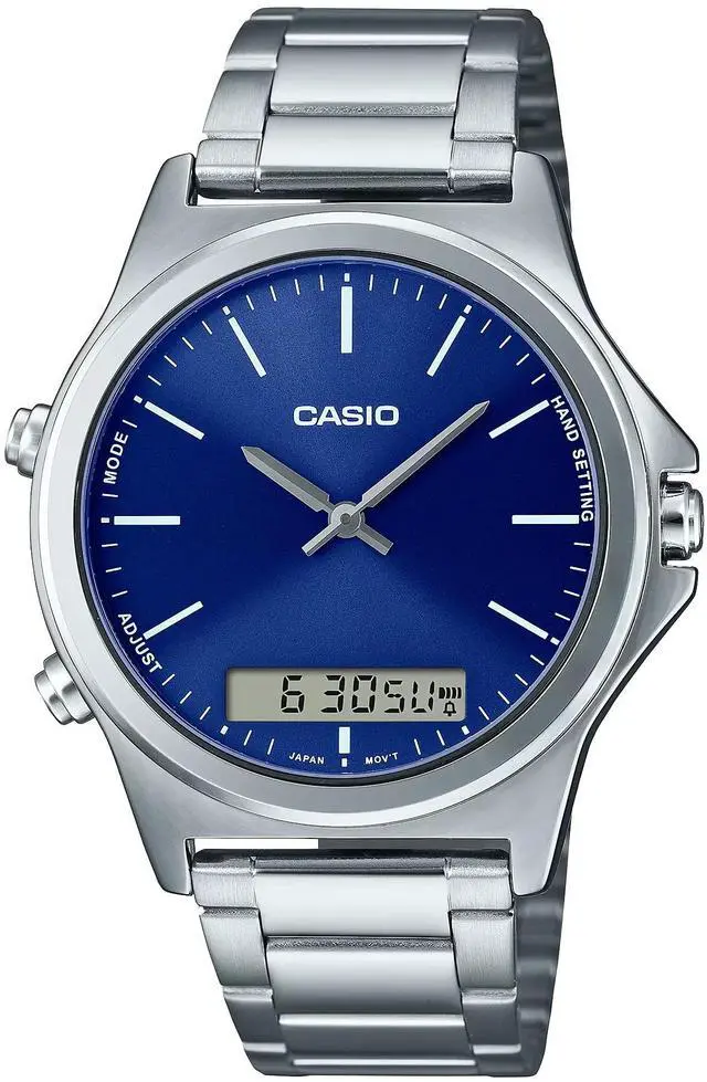 This Casio mens ana digi watch combines a classic analog dial with a digital display for added daily functionality. The deep blue dial features clean markers that keep the time easy to read at a glance. A digital screen at the lower portion of the dial provides additional time and function visibility. The stainless steel bracelet offers a secure and comfortable fit for everyday wear. Designed for versatility, this watch suits work, casual use, and daily routines.