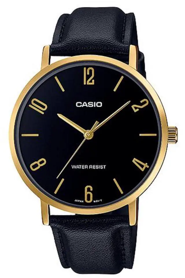 The Casio MTP-VT01GL-1B2UDF delivers a refined minimalist look with a bold black dial framed by a gold tone case. Slim hour markers and clean numerals create an easy-to-read layout designed for everyday wear. The analog display offers classic timekeeping powered by a precise Japanese quartz movement. A black leather strap adds contrast and comfort for all-day use. This watch transitions effortlessly from professional settings to casual evenings.