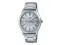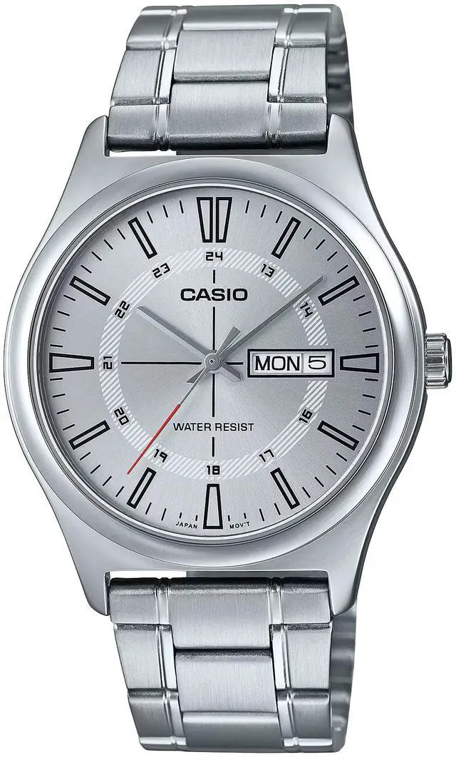 This Casio mens analog watch features a clean silver dial with a detailed inner 24-hour ring and bold hour markers for easy readability throughout the day. The day date display at 3 oclock adds practical functionality while maintaining a balanced, refined look. A stainless steel bracelet and round case give the watch a classic profile that works effortlessly for daily wear or office settings. Designed for reliability, it is water resistant up to 50 meters for everyday exposure. Precise Japanese quartz movement ensures accurate timekeeping with minimal maintenance.