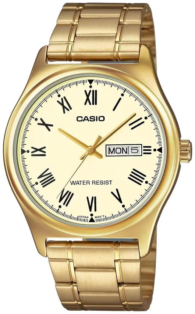 This Casio mens analog watch features a warm gold-tone case and bracelet paired with a classic ivory dial for a distinguished everyday look. The dial is accented with bold Roman numeral markers and refined gold hands for clear readability with timeless styling. A convenient day-date display at 3 oclock adds practical daily functionality without overwhelming the clean dial design. The polished stainless steel bracelet provides durable wear and a secure fit suitable for work or casual occasions. Powered by a reliable quartz movement and finished with everyday water resistance, this watch combines classic style with dependable performance.